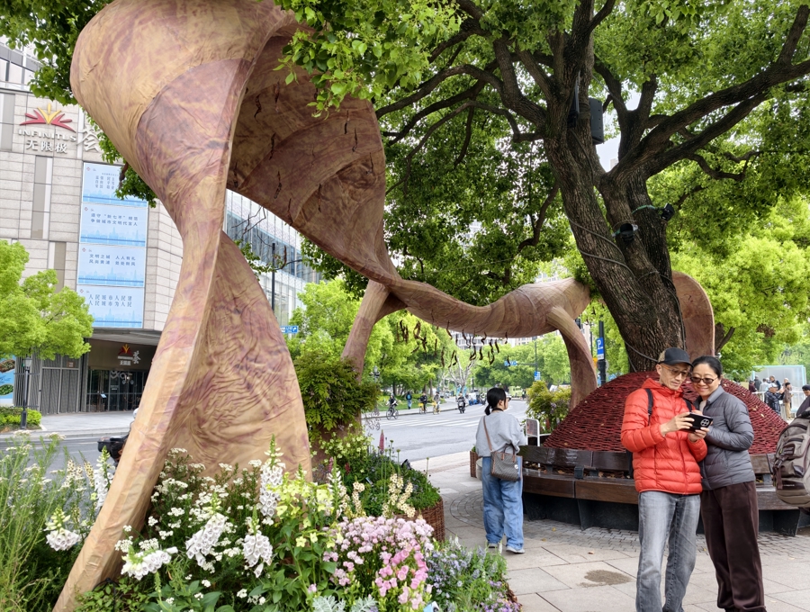 上午9时许,新民晚报记者来到黄浦城市主会场。在新天地太平湖沿岸,各座主题花园吸引了众多市民游客驻足观赏。