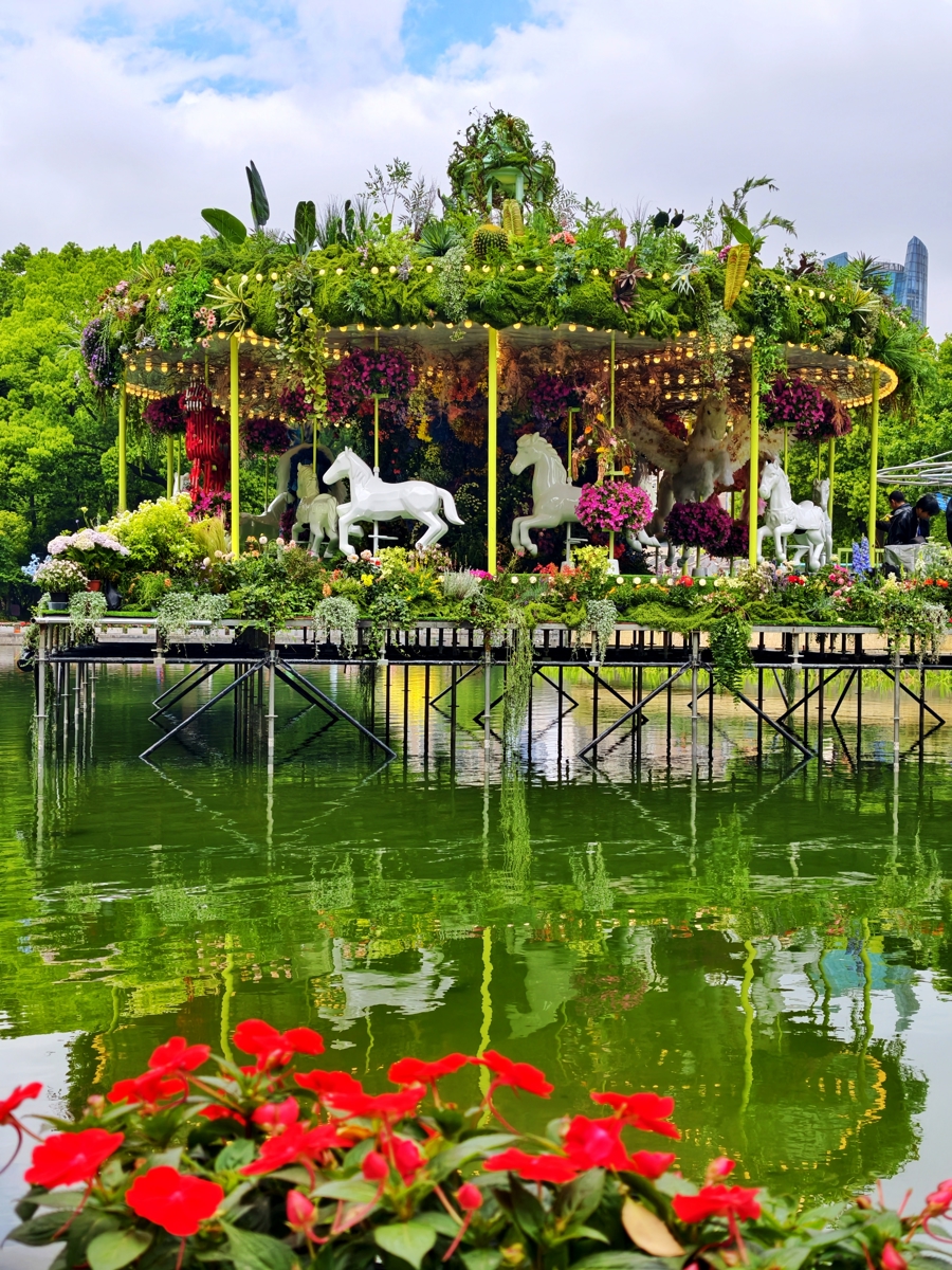 太平湖畔,一座嵌于水面、亮灯后倒影绰约的鲜花旋转木马,唤醒了无数上海人的童年记忆。手工制作的骏马矗立水面,表面覆满鲜花与绿植,与石库门建筑群相映成景。“小时候家住复兴公园边,常去坐旋转木马。今天又看到了旋转木马出现在市中心街头,非常亲切。”市民张女士说。