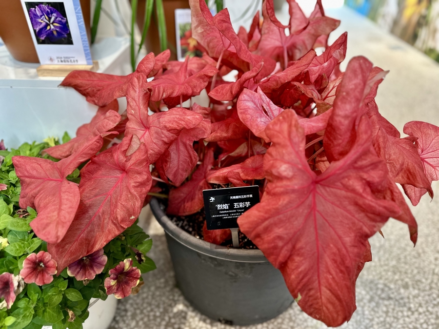 而上海辰山植物园的“辰山红柱”木芙蓉由木芙蓉和大花芙蓉葵杂交而成,结合两者优点,不仅抗性更强,花期也能越冬了。上海园科院“红笑”夏蜡梅以国家二级保护植物夏蜡梅为父本,花量繁密。上海花卉园艺集团与鲜花港共同培育的“烈焰”五彩芋则色彩艳丽、抗病性强。