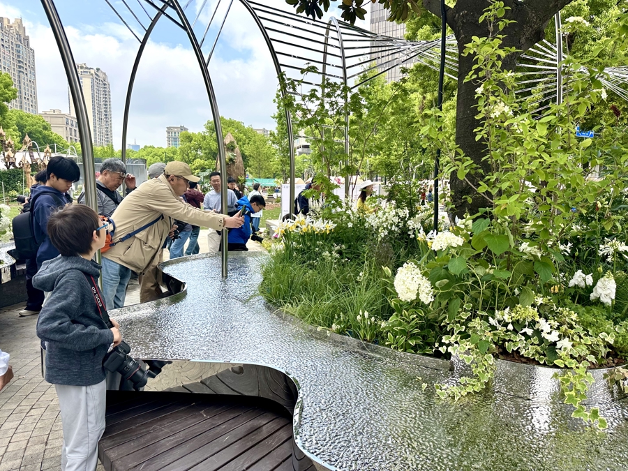 沿湖而行,“主理人花园”同样人气高涨。在获得一等奖的“溪涧花园”外,设计师岩颜团队正在为水池注水,为作品进行最后的完善。在这些不同主题的主理人花园里,路过市民纷纷举起手机,因为他们惊喜地发现,在市中心也能听溪水潺潺、看石桥拱门、赏草木清幽。