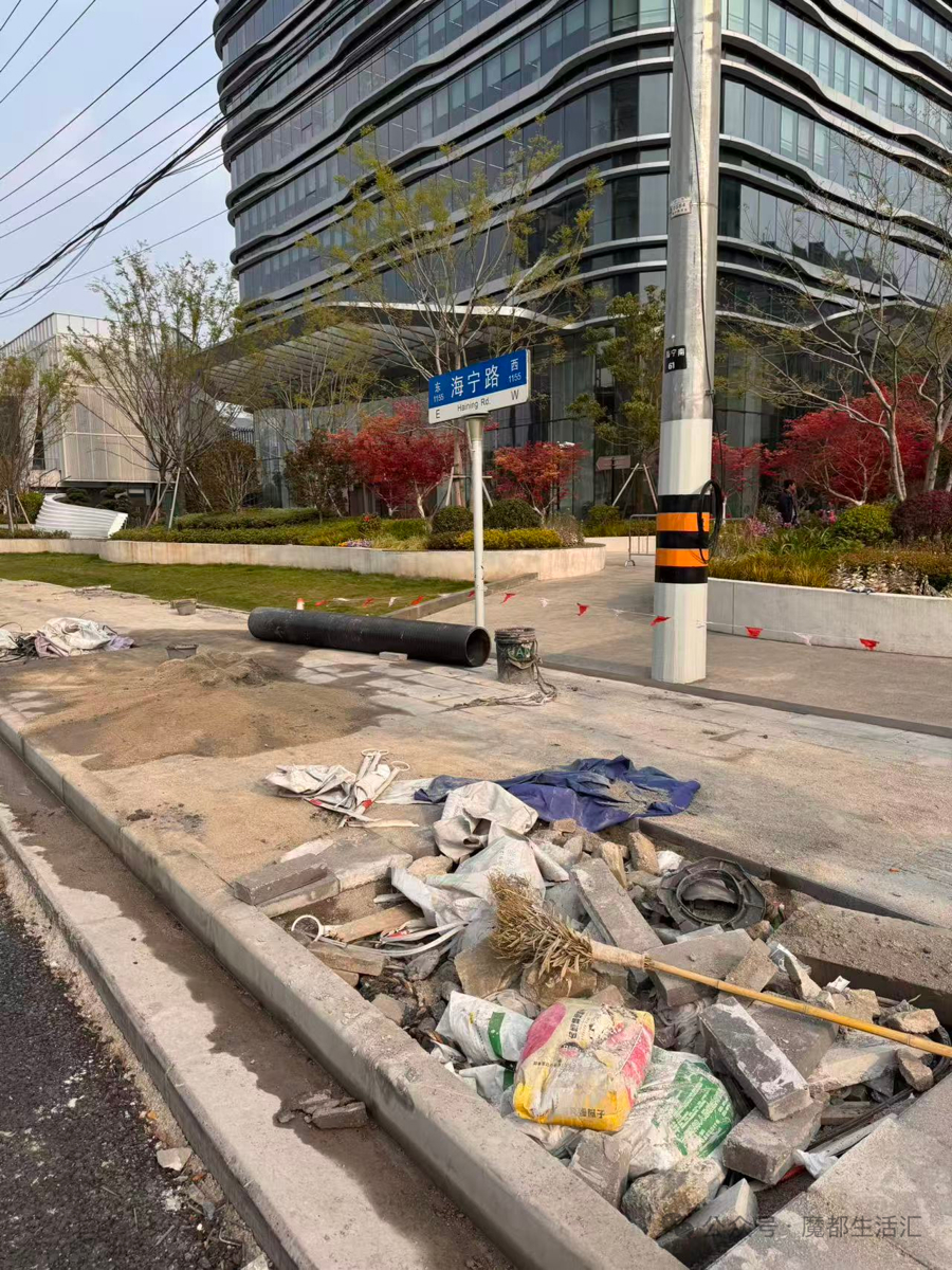 记者前往海宁路与文安路交叉口实地走访。现场可见,南侧人行道上排列着多个矩形树坑,坑口的颜色与周边灰色地砖极为接近,在光线较暗或雨天视线不佳时几乎难以辨识。更为严重的是,这些坑位四周未设置任何物理隔离设施,如围栏、警示带或反光锥桶,行人通行时极易因误判而踩空跌落。